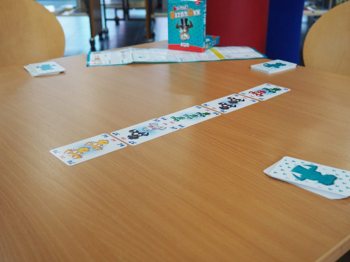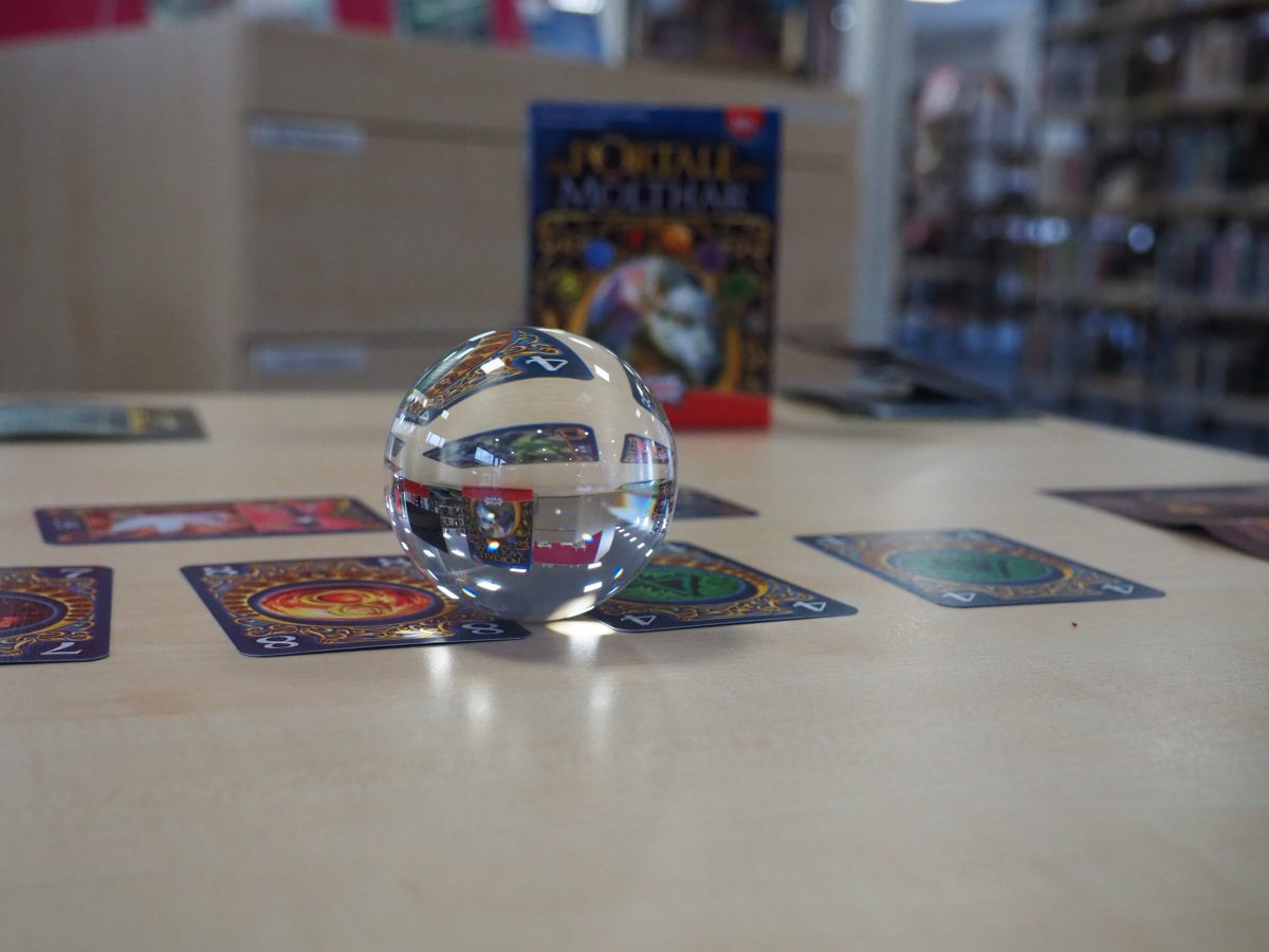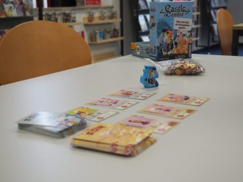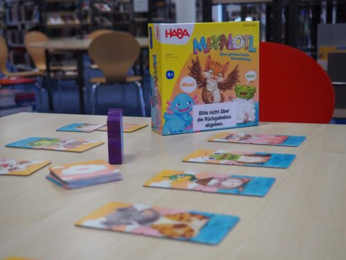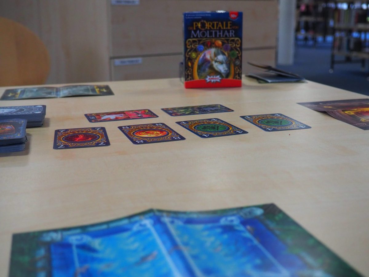 Die Stadtbücherei hatte dank einer speziellen Förderung für das Event eine große Auswahl an Spielen zusammengestellt, die an diesem Tag zur Verfügung stand. Das Spektrum war bewusst breit gefächert und bot für jeden Geschmack etwas: Von kompakten Roll-and-Write-Spielen wie “Calavera” über Kartenspiele wie “Portale von Molthar” und “My Gold Mine” bis hin zu spannenden Brettspielneuheiten war alles dabei.
